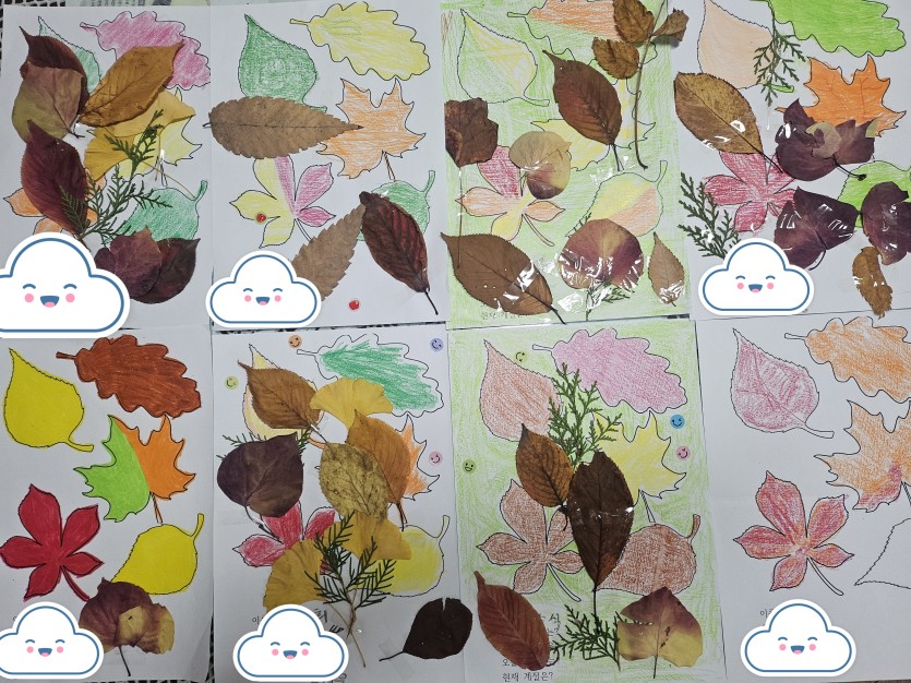 프로그램 ) 나뭇잎 놀이. 나뭇잎 밑그림을 색칠하고 그 위에 낙엽을 붙여봐요.